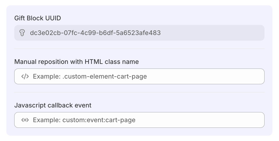 If you have multiple gift blocks and want to customize only specific ones, you can target them using their unique UUID: