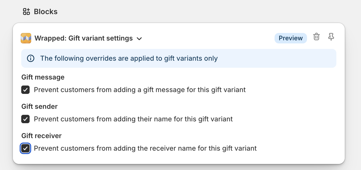 - Disable gift messaging fields for the gift variant by ticking the checkboxes, and press Save.