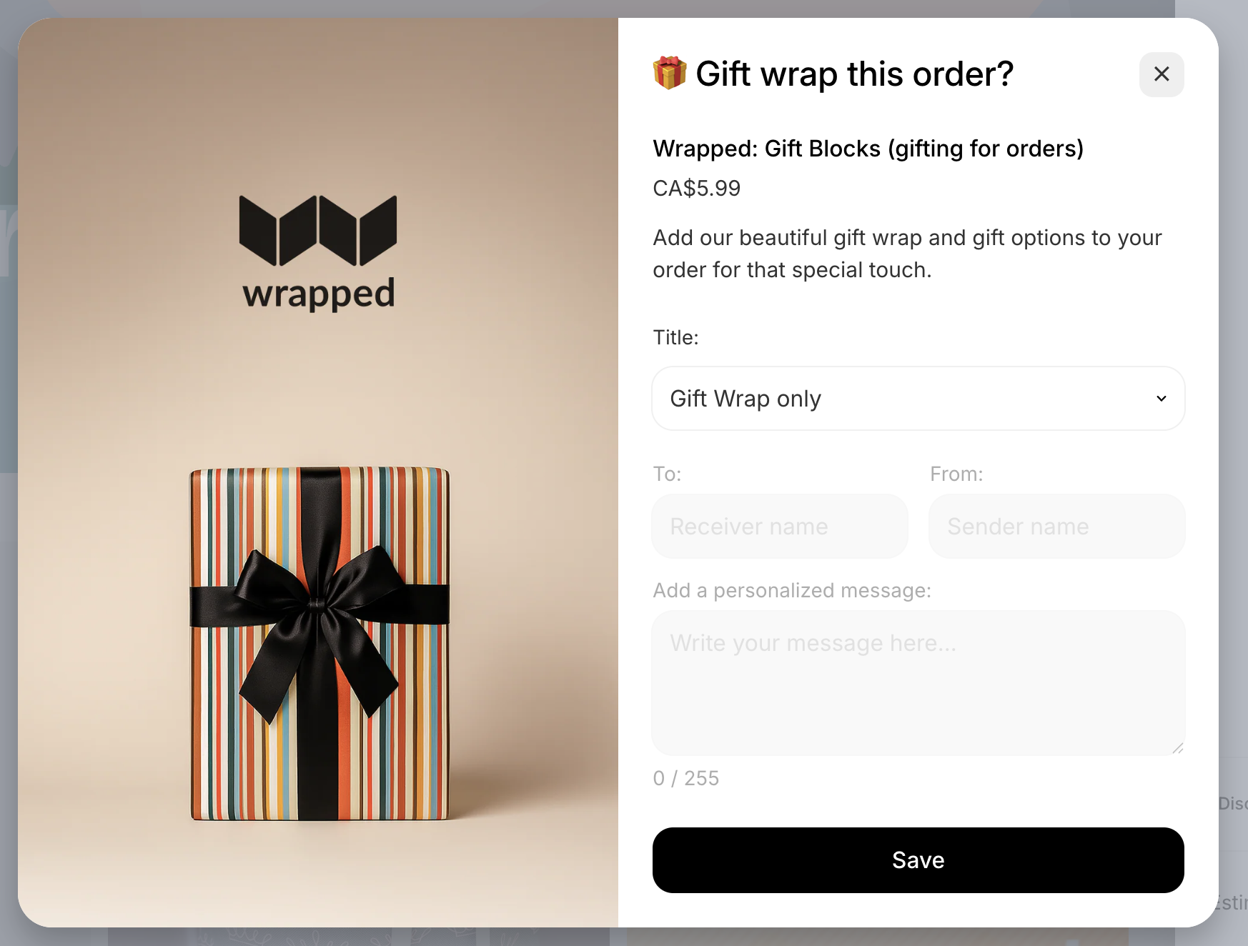 This guide will help you customize individual gift variants further by preventing customers from adding gift messaging details on certain gift variants of your choosing. For example, you may wish to offer two gift variants ("Gift Wrap + Handwritten note", and "Gift Wrap only").
