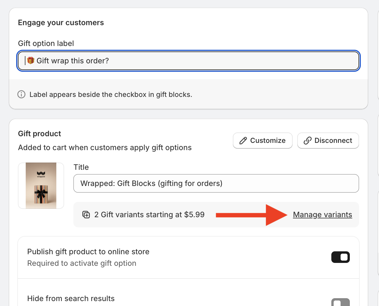 - Click "Manage Variants" in Wrapped gift option settings below your connected gift product. You must have a connected gift product in your gift option settings.